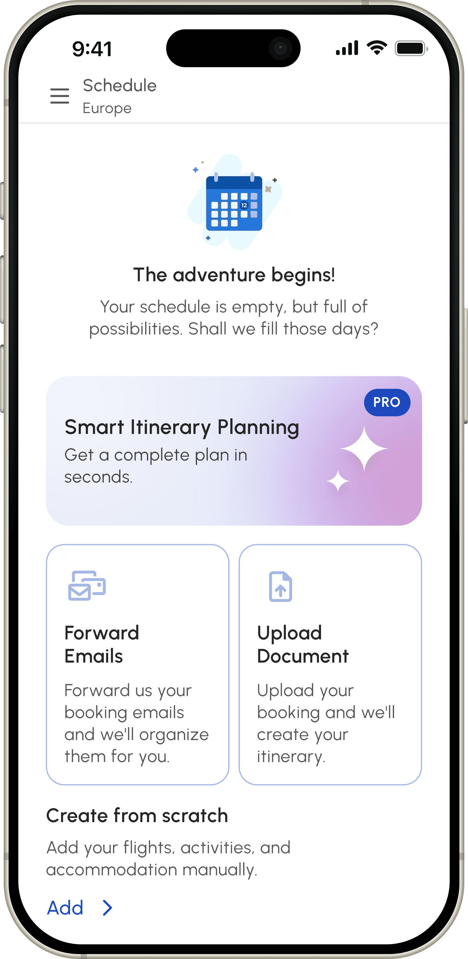 Manual entry, PDF upload, or AI generation. You choose how to build your perfect trip